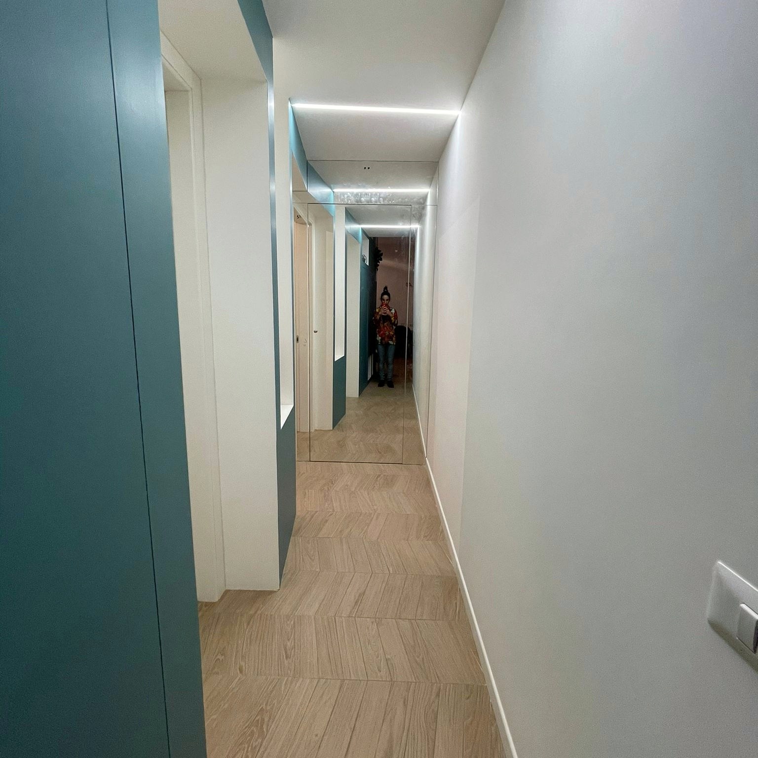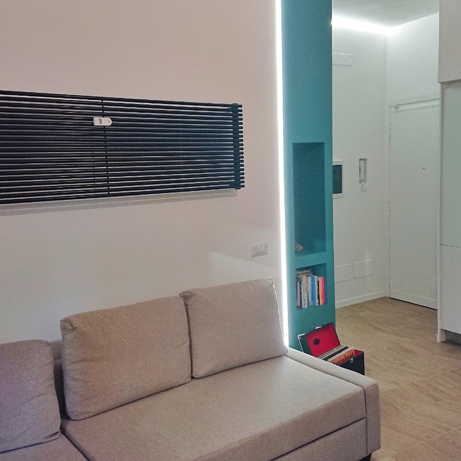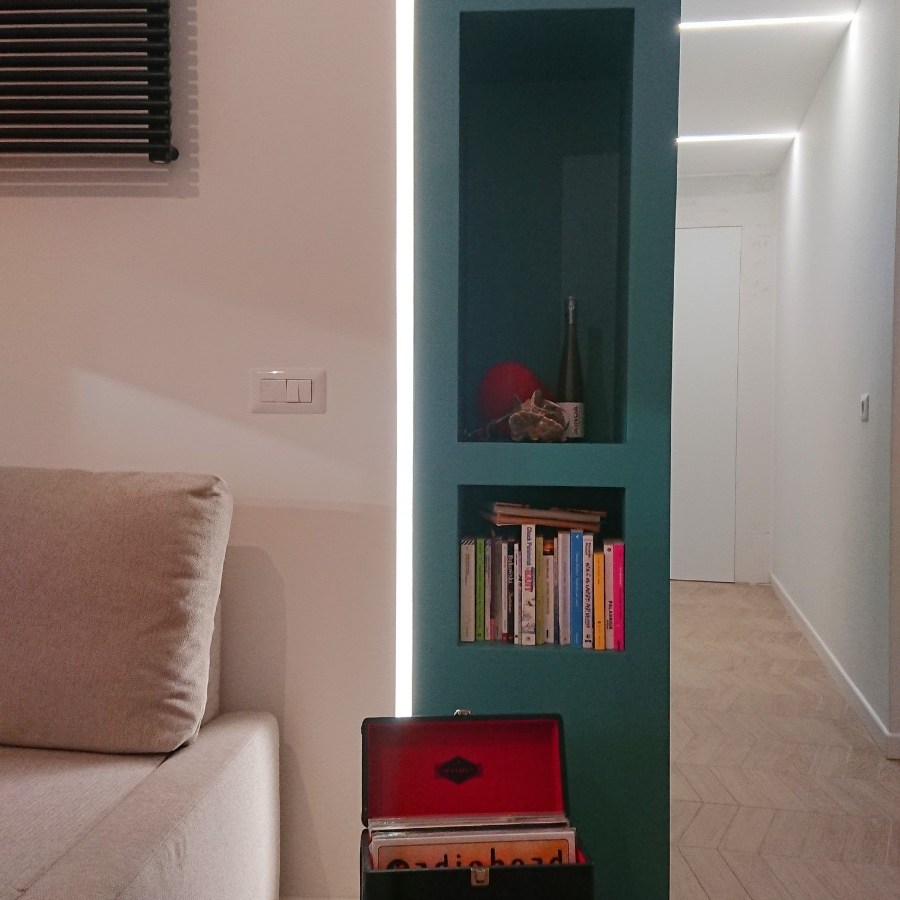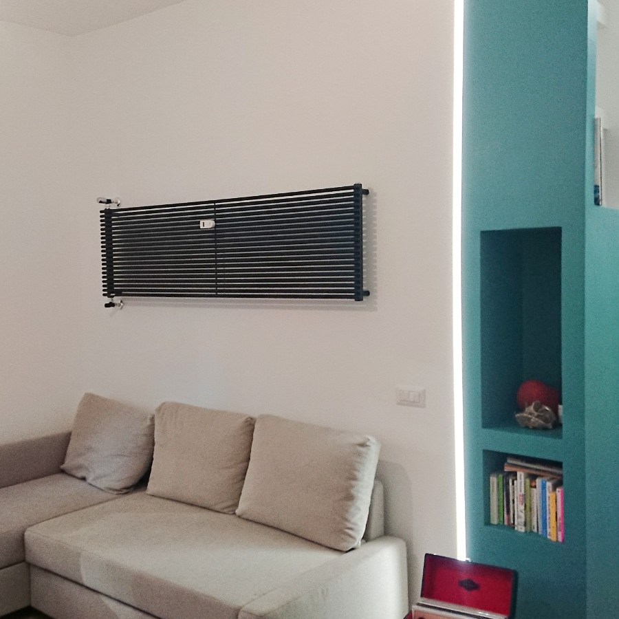 Completano il tutto la scelta di materiali di qualità, come le piastrelle in grès di pavimento e rivestimenti (Porcelanosa), il termoarredo nero (Cordivari) che, come un quadro, si staglia sulla parete dietro al divano e la porta filo muro della camera da letto in fondo al corridoio rivestita, poi, con uno scenografico specchio a tutt’altezza!