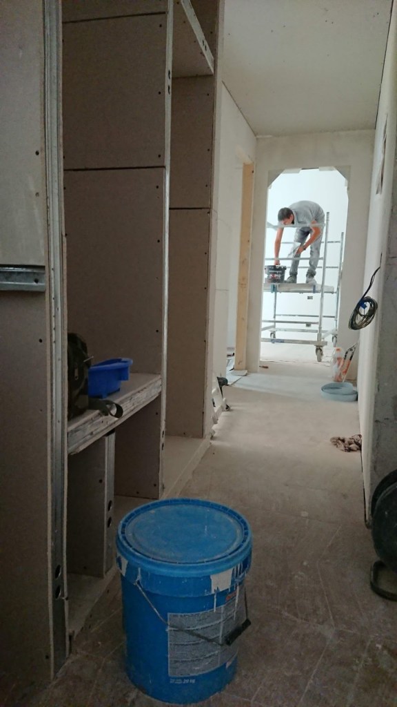 Pertanto abbiamo optato per la più economica soluzione di installare una tenda motorizzata che scorresse all’interno della veletta in cartongesso realizzata sopra i pensili e che, una volta chiusa, potesse essere usata come telo di proiezione. L’idea è piaciuta tantissimo e sulle ali dell’entusiasmo della cliente e del nostro, abbiamo progettato la lunga scrivania in legno che sottolineasse ancora di più la duplice funzione di quello spazio nonché lo stile nordico richiesto.
