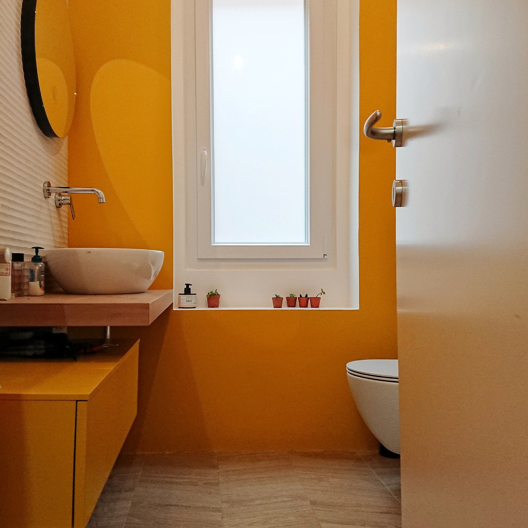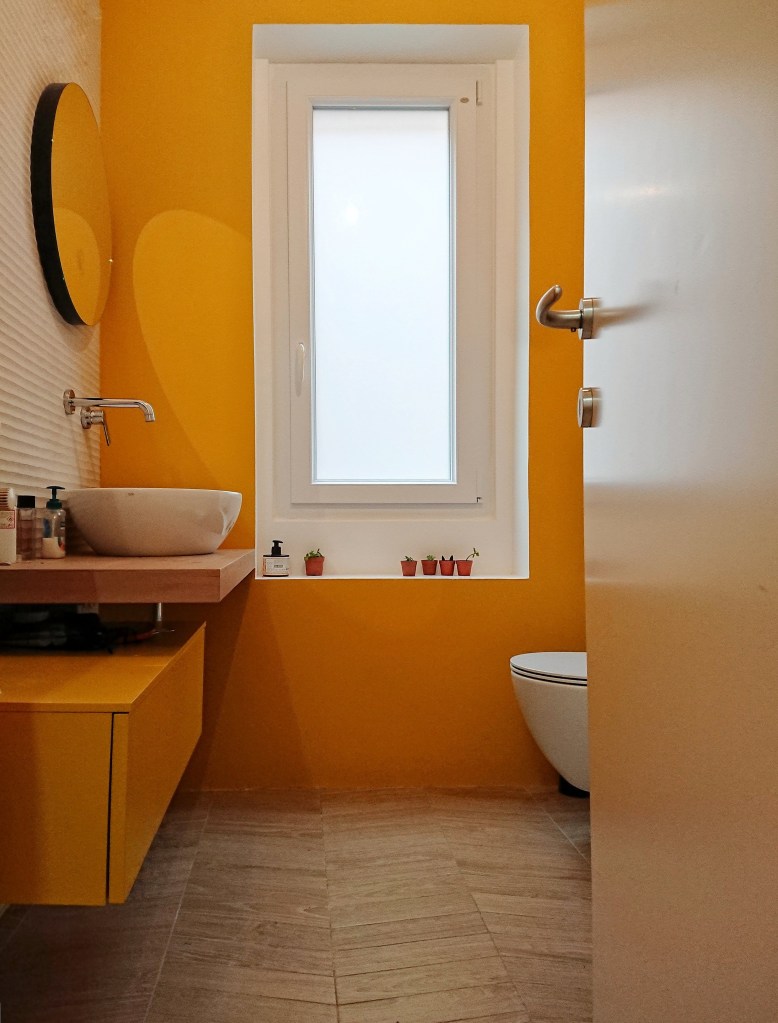 Le nostre fresche idee hanno presto incontrato i gusti della proprietaria trentenne che vede la sua vivacità rispecchiarsi nella scelta dei colori accesi della parete attrezzata “blu Olivetti” e della parete di fondo giallo ocra del bagno.